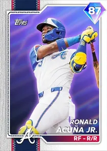 This is the Live card for Ronald Acuña Jr., featured in MLB The Show 26. He's a 87 Overall Diamond card primarily playing RF. Available on the marketplace for around 44,251 stubs (buy now price). Ronald Acuña Jr. has a elite Meta Score of 84.15, indicating his overall effectiveness in competitive play. At the plate, Ronald Acuña Jr. displays great contact overall, with specific ratings of 95 Contact vs Right and 79 Contact vs Left. He brings good power to the plate, evident from his 81 Power vs Right and 75 Power vs Left. In terms of plate discipline, his good Vision stands at 73, paired with his elite Discipline rating of 90. On the basepaths, Ronald Acuña Jr. showcases average speed and good stealing ability. This is supported by 65 Speed, a 70 Stealing rating, 0 Baserunning Ability, and 70 Baserunning Aggression. Ronald Acuña Jr. is a 28-year-old baseball player, stands 6'0" and weighs 205 lbs, born in Venezuela, currently playing for the Braves, bats R and throws R. Active Quirks for Ronald Acuña Jr.: Homebody, First-Pitch Hitter, Dead Red, Unfazed, Rally Monkey, Day Player, Table Setter. Other available versions for Ronald Acuña Jr. include: Speedway Classic (99 Diamond), Spotlight (99 Diamond), All-Star (94 Diamond), Live (90 Diamond), World Baseball Classic (90 Diamond).