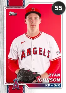 This is the Live card for Ryan Johnson, featured in MLB The Show 26. He's a 55 Overall Common card primarily playing RP. Available on the marketplace for around 7 stubs (buy now price). Ryan Johnson has a elite Meta Score of 54.05, indicating his overall effectiveness in competitive play. On the mound, Ryan Johnson exhibits below average H/9 with a 45 rating, below average K/9 with a 56 rating, and below average BB/9 with a 44 rating. His overall pitching profile is defined by below average control with a Control rating of 51, good velocity with a Velocity rating of 77, and below average break with a Break rating of 54. He utilizes a 5-pitch mix, spearheaded by a Cutter, complemented by a Sweeper. Key pitches include: Cutter, Sweeper, Sinker, Slider, Splitter. Ryan Johnson is a 23-year-old baseball player, stands 6'6" and weighs 215 lbs, born in Texas, currently playing for the Angels, bats S and throws R. Other available versions for Ryan Johnson include: Live (55 Common).