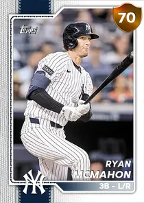This is the Live card for Ryan McMahon, featured in MLB The Show 26. He's a 70 Overall Bronze card primarily playing 3B. Available on the marketplace for around 25 stubs (buy now price). Ryan McMahon has a elite Meta Score of 63.46, indicating his overall effectiveness in competitive play. At the plate, Ryan McMahon displays below average contact overall, with specific ratings of 59 Contact vs Right and 56 Contact vs Left. He brings average power to the plate, evident from his 67 Power vs Right and 52 Power vs Left. In terms of plate discipline, his below average Vision stands at 39, paired with his great Discipline rating of 80. In the field, Ryan McMahon is a great defender. His key defensive attributes are 82 Fielding, 68 Arm Strength, and 73 Reaction time. On the basepaths, Ryan McMahon showcases below average speed and below average stealing ability. This is supported by 44 Speed, a 3 Stealing rating, and 28 Baserunning Aggression. Ryan McMahon is a 31-year-old baseball player, stands 6'2" and weighs 219 lbs, born in California, currently playing for the Yankees, bats L and throws R. Other available versions for Ryan McMahon include: New Threads (99 Diamond), Egg Hunt (89 Diamond), All-Star (83 Gold), Live (72 Bronze).