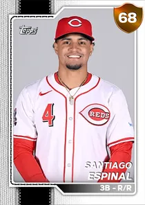 This is the Live card for Santiago Espinal, featured in MLB The Show 26. He's a 68 Overall Bronze card primarily playing 3B. He can also fill in at 2B, SS. Available on the marketplace for around 25 stubs (sell now price). Santiago Espinal has a elite Meta Score of 58.88, indicating his overall effectiveness in competitive play. At the plate, Santiago Espinal displays average contact overall, with specific ratings of 54 Contact vs Right and 74 Contact vs Left. He brings below average power to the plate, evident from his 30 Power vs Right and 40 Power vs Left. In terms of plate discipline, his great Vision stands at 88, paired with his below average Discipline rating of 48. In the field, Santiago Espinal is a average defender. His key defensive attributes are 67 Fielding, 48 Arm Strength, and 62 Reaction time. On the basepaths, Santiago Espinal showcases below average speed and below average stealing ability. This is supported by 51 Speed, a 39 Stealing rating, and 40 Baserunning Aggression. Santiago Espinal is a 31-year-old baseball player, stands 5'10" and weighs 185 lbs, born in Dominican Republic, currently playing for the Free Agents, bats R and throws R. Other available versions for Santiago Espinal include: Live (73 Bronze).