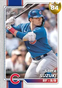 This is the Live card for Seiya Suzuki, featured in MLB The Show 26. He's a 84 Overall Gold card primarily playing RF. He can also fill in at LF. Available on the marketplace for around 1,550 stubs (buy now price). Seiya Suzuki has a elite Meta Score of 75.81, indicating his overall effectiveness in competitive play. At the plate, Seiya Suzuki displays good contact overall, with specific ratings of 75 Contact vs Right and 75 Contact vs Left. He brings good power to the plate, evident from his 74 Power vs Right and 80 Power vs Left. In terms of plate discipline, his below average Vision stands at 54, paired with his good Discipline rating of 77. In the field, Seiya Suzuki is a average defender. His key defensive attributes are 62 Fielding, 85 Arm Strength, and 66 Reaction time. On the basepaths, Seiya Suzuki showcases good speed and below average stealing ability. This is supported by 72 Speed, a 35 Stealing rating, 0 Baserunning Ability, and 53 Baserunning Aggression. Seiya Suzuki is a 31-year-old baseball player, stands 6'0" and weighs 182 lbs, born in Japan, currently playing for the Cubs, bats R and throws R. Active Quirks for Seiya Suzuki: Road Warrior, Situational Hitter, Day Player. Other available versions for Seiya Suzuki include: 2025 Postseason (99 Diamond), World Baseball Classic (88 Diamond), Live (85 Diamond), Tokyo (85 Diamond).