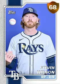 This is the Live card for Steven Wilson, featured in MLB The Show 26. He's a 68 Overall Bronze card primarily playing RP. Available on the marketplace for around 27 stubs (buy now price). Steven Wilson has a elite Meta Score of 66.47, indicating his overall effectiveness in competitive play. On the mound, Steven Wilson exhibits good H/9 with a 76 rating, below average K/9 with a 59 rating, and below average BB/9 with a 42 rating. With runners threatening, his Pitching Clutch rating of 81 shows great performance. His overall pitching profile is defined by below average control with a Control rating of 45, good velocity with a Velocity rating of 72, and elite break with a Break rating of 92. He utilizes a 4-pitch mix, spearheaded by a Sweeper, complemented by a 4-Seam Fastball. Key pitches include: Sweeper, 4-Seam Fastball, Circle Change, Cutter. Steven Wilson is a 31-year-old baseball player, stands 6'3" and weighs 221 lbs, born in Colorado, currently playing for the Rays, bats R and throws R. Other available versions for Steven Wilson include: Live (66 Bronze).
