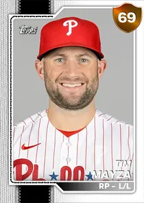 This is the Live card for Tim Mayza, featured in MLB The Show 26. He's a 69 Overall Bronze card primarily playing RP. Available on the marketplace for around 31 stubs (sell now price). Tim Mayza has a elite Meta Score of 67.63, indicating his overall effectiveness in competitive play. On the mound, Tim Mayza exhibits below average H/9 with a 55 rating, below average K/9 with a 51 rating, and great BB/9 with a 83 rating. His overall pitching profile is defined by average control with a Control rating of 66, elite velocity with a Velocity rating of 90, and elite break with a Break rating of 99. He utilizes a 3-pitch mix, spearheaded by a Sinker, complemented by a Slider. Key pitches include: Sinker, Slider, 4-Seam Fastball. Tim Mayza is a 34-year-old baseball player, stands 6'3" and weighs 215 lbs, born in Pennsylvania, currently playing for the Free Agents, bats L and throws L. Other available versions for Tim Mayza include: Live (70 Bronze).