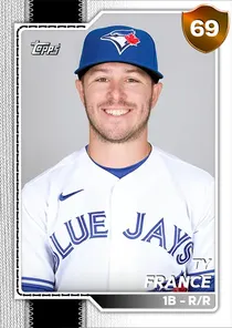 This is the Live card for Ty France, featured in MLB The Show 26. He's a 69 Overall Bronze card primarily playing 1B. Available on the marketplace for around 25 stubs (sell now price). Ty France has a elite Meta Score of 63.93, indicating his overall effectiveness in competitive play. At the plate, Ty France displays average contact overall, with specific ratings of 64 Contact vs Right and 66 Contact vs Left. He brings below average power to the plate, evident from his 45 Power vs Right and 49 Power vs Left. In terms of plate discipline, his good Vision stands at 72, paired with his below average Discipline rating of 46. In the field, Ty France is a average defender. His key defensive attributes are 67 Fielding, 30 Arm Strength, and 64 Reaction time. Ty France is a 31-year-old baseball player, stands 5'11" and weighs 215 lbs, born in California, currently playing for the Free Agents, bats R and throws R. Active Quirks for Ty France: Fighter, Pinch Hitter. Other available versions for Ty France include: Topps Now (88 Diamond), Live (73 Bronze).