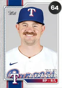 This is the Live card for Tyler Alexander, featured in MLB The Show 26. He's a 64 Overall Common card primarily playing RP. Available on the marketplace for around 17 stubs (sell now price). Tyler Alexander has a elite Meta Score of 64.15, indicating his overall effectiveness in competitive play. On the mound, Tyler Alexander exhibits below average H/9 with a 51 rating, below average K/9 with a 52 rating, and great BB/9 with a 81 rating. His overall pitching profile is defined by good control with a Control rating of 72, average velocity with a Velocity rating of 69, and good break with a Break rating of 79. He utilizes a 5-pitch mix, spearheaded by a 4-Seam Fastball, complemented by a Sweeper. Key pitches include: 4-Seam Fastball, Sweeper, Sinker, Cutter, Circle Change. Tyler Alexander is a 31-year-old baseball player, stands 6'1" and weighs 214 lbs, born in Illinois, currently playing for the Rangers, bats R and throws L. Active Quirks for Tyler Alexander: Break Outlier. Other available versions for Tyler Alexander include: Live (68 Bronze).
