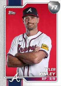 This is the Live card for Tyler Kinley, featured in MLB The Show 26. He's a 77 Overall Silver card primarily playing RP. Available on the marketplace for around 110 stubs (buy now price). Tyler Kinley has a elite Meta Score of 74.71, indicating his overall effectiveness in competitive play. On the mound, Tyler Kinley exhibits elite H/9 with a 99 rating, below average K/9 with a 56 rating, and average BB/9 with a 65 rating. His overall pitching profile is defined by average control with a Control rating of 62, good velocity with a Velocity rating of 79, and average break with a Break rating of 62. He utilizes a 4-pitch mix, spearheaded by a Slider, complemented by a 4-Seam Fastball. Key pitches include: Slider, 4-Seam Fastball, 12-6 Curve, Circle Change. Tyler Kinley is a 35-year-old baseball player, stands 6'4" and weighs 220 lbs, born in Florida, currently playing for the Braves, bats R and throws R. Other available versions for Tyler Kinley include: Live (72 Bronze).