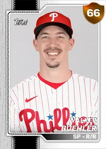 This is the Live card for Walker Buehler, featured in MLB The Show 26. He's a 66 Overall Bronze card primarily playing SP. Available on the marketplace for around 30 stubs (sell now price). Walker Buehler has a elite Meta Score of 64.35, indicating his overall effectiveness in competitive play. On the mound, Walker Buehler exhibits below average H/9 with a 49 rating, below average K/9 with a 48 rating, and below average BB/9 with a 54 rating. His overall pitching profile is defined by average control with a Control rating of 65, elite velocity with a Velocity rating of 91, and elite break with a Break rating of 99. He utilizes a 5-pitch mix, spearheaded by a 4-Seam Fastball, complemented by a Cutter. Key pitches include: 4-Seam Fastball, Cutter, Sinker, Slider, Knuckle-curve. Walker Buehler is a 31-year-old baseball player, stands 6'2" and weighs 185 lbs, born in Kentucky, currently playing for the Free Agents, bats R and throws R. Other available versions for Walker Buehler include: New Threads (88 Diamond), Live (68 Bronze).