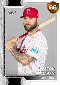 This is the Live card for Weston Wilson, featured in MLB The Show 26. He's a 66 Overall Bronze card primarily playing 3B. He can also fill in at 1B, 2B, SS, LF, RF. Available on the marketplace for around 26 stubs (sell now price). Weston Wilson has a elite Meta Score of 54.75, indicating his overall effectiveness in competitive play. At the plate, Weston Wilson displays below average contact overall, with specific ratings of 45 Contact vs Right and 50 Contact vs Left. He brings below average power to the plate, evident from his 48 Power vs Right and 62 Power vs Left. In terms of plate discipline, his below average Vision stands at 47, paired with his average Discipline rating of 65. On the basepaths, Weston Wilson showcases average speed and below average stealing ability. This is supported by 67 Speed, a 15 Stealing rating, and 16 Baserunning Aggression. Weston Wilson is a 31-year-old baseball player, stands 6'1" and weighs 215 lbs, born in North Carolina, currently playing for the Free Agents, bats R and throws R. Other available versions for Weston Wilson include: Live (67 Bronze).