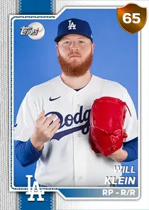 This is the Live card for Will Klein, featured in MLB The Show 26. He's a 65 Overall Bronze card primarily playing RP. Available on the marketplace for around 38 stubs (sell now price). Will Klein has a elite Meta Score of 61.07, indicating his overall effectiveness in competitive play. On the mound, Will Klein exhibits average H/9 with a 62 rating, good K/9 with a 73 rating, and below average BB/9 with a 38 rating. His overall pitching profile is defined by below average control with a Control rating of 52, elite velocity with a Velocity rating of 93, and below average break with a Break rating of 59. He utilizes a 4-pitch mix, spearheaded by a 4-Seam Fastball, complemented by a Curveball. Key pitches include: 4-Seam Fastball, Curveball, Cutter, Sweeper. Will Klein is a 26-year-old baseball player, stands 6'5" and weighs 230 lbs, born in Indiana, currently playing for the Dodgers, bats R and throws R. Other available versions for Will Klein include: 2025 Postseason (99 Diamond), Live (57 Common).