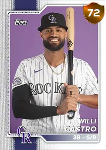 This is the Live card for Willi Castro, featured in MLB The Show 26. He's a 72 Overall Bronze card primarily playing 3B. He can also fill in at 2B, SS, LF, CF, RF. Available on the marketplace for around 91 stubs (buy now price). Willi Castro has a elite Meta Score of 62.34, indicating his overall effectiveness in competitive play. At the plate, Willi Castro displays average contact overall, with specific ratings of 58 Contact vs Right and 63 Contact vs Left. He brings below average power to the plate, evident from his 46 Power vs Right and 55 Power vs Left. In terms of plate discipline, his below average Vision stands at 57, paired with his average Discipline rating of 61. In the field, Willi Castro is a below average defender. His key defensive attributes are 59 Fielding, 83 Arm Strength, and 63 Reaction time. On the basepaths, Willi Castro showcases good speed and below average stealing ability. This is supported by 70 Speed, a 40 Stealing rating, 0 Baserunning Ability, and 60 Baserunning Aggression. Willi Castro is a 28-year-old baseball player, stands 6'0" and weighs 206 lbs, born in Puerto Rico, currently playing for the Rockies, bats S and throws R. Other available versions for Willi Castro include: New Threads (99 Diamond), Topps Now (93 Diamond), World Baseball Classic (88 Diamond), Live (76 Silver).