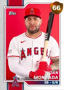 This is the Live card for Yoán Moncada, featured in MLB The Show 26. He's a 66 Overall Bronze card primarily playing 3B. Available on the marketplace for around 41 stubs (buy now price). Yoán Moncada has a elite Meta Score of 57.58, indicating his overall effectiveness in competitive play. At the plate, Yoán Moncada displays average contact overall, with specific ratings of 66 Contact vs Right and 62 Contact vs Left. He brings below average power to the plate, evident from his 62 Power vs Right and 50 Power vs Left. In terms of plate discipline, his below average Vision stands at 48, paired with his average Discipline rating of 60. Yoán Moncada is a 30-year-old baseball player, stands 6'0" and weighs 220 lbs, born in Cuba, currently playing for the Angels, bats S and throws R. Active Quirks for Yoán Moncada: Homebody, Pinch Hitter. Other available versions for Yoán Moncada include: World Baseball Classic (87 Diamond), Live (74 Bronze).