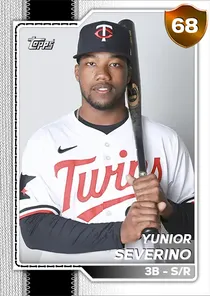 This is the Live card for Yunior Severino, featured in MLB The Show 26. He's a 68 Overall Bronze card primarily playing 3B. He can also fill in at 1B, 2B, SS, LF, RF. Available on the marketplace for around 26 stubs (sell now price). Yunior Severino has a elite Meta Score of 57.25, indicating his overall effectiveness in competitive play. At the plate, Yunior Severino displays below average contact overall, with specific ratings of 49 Contact vs Right and 55 Contact vs Left. He brings below average power to the plate, evident from his 49 Power vs Right and 54 Power vs Left. In terms of plate discipline, his below average Vision stands at 49, paired with his below average Discipline rating of 49. In the field, Yunior Severino is a below average defender. His key defensive attributes are 59 Fielding, 61 Arm Strength, and 63 Reaction time. On the basepaths, Yunior Severino showcases average speed and below average stealing ability. This is supported by 68 Speed, a 25 Stealing rating, and 30 Baserunning Aggression. Yunior Severino is a 26-year-old baseball player, stands 6'0" and weighs 189 lbs, born in Dominican Republic, currently playing for the Free Agents, bats S and throws R. Other available versions for Yunior Severino include: Live (67 Bronze).